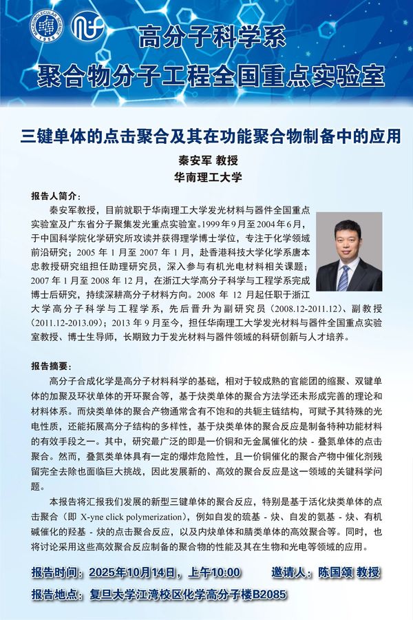 2025年10月14日,来自华南理工大学的秦安军教授来复旦大学高分子科学系进行交流访问,并进行了题为“三键单体的点击聚合及其在功能聚合物制备中的应用”的报告,报告介绍了他们发展的新型三键单体的聚合反应,特别是基于活化炔类单体的点击聚合(即 X-yne click polymerization),例如自发的巯基-炔、自发的氨基-炔、有机碱催化的羟基-炔的点击聚合反应,以及内炔单体和腈类单体的高效聚合等。同时,也将讨论采用这些高效聚合反应制备的聚合物的性能及其在生物和光电等领域的应用。