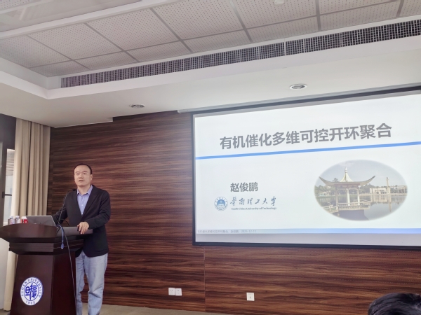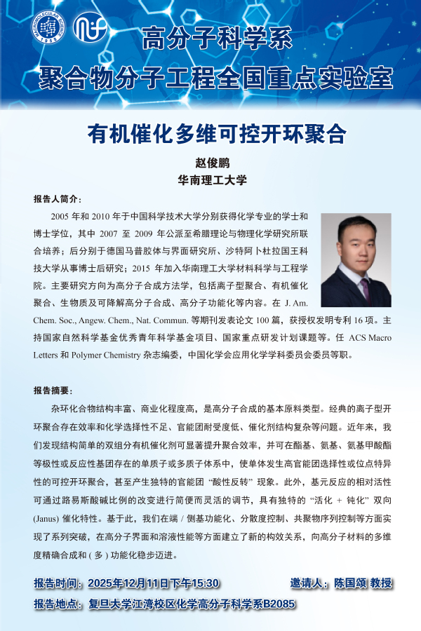 2025年12月11日,来自华南理工大学的赵俊鹏教授来复旦大学高分子科学系进行交流访问,并进行了题为“有机催化多维可控开环聚合”的报告,报告介绍了他们发现结构简单的双组分有机催化剂可显著提升聚合效率,并可在酯基、氨基、氨基甲酸酯等极性或反应性基团存在的单质子或多质子体系中,使单体发生高官能团选择性或位点特异性的可控开环聚合,甚至产生独特的官能团“酸性反转”现象。此外,基元反应的相对活性可通过路易斯酸碱比例的改变进行简便而灵活的调节,具有独特的“活化+钝化”双向(Janus)催化特性。基于此,他们在端/侧基功能化、分散度控制、共聚物序列控制等方面实现了系列突破,在高分子界面和溶液性能等方面建立了新的构效关系,向高分子材料的多维度精确合成和(多)功能化稳步迈进。