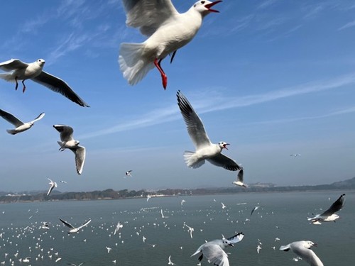 既然比打卡游深入不了多少,自然不能错过鼋头渚。乘船踏上太湖仙岛,才能体会这一仙字。那日天气晴朗而空气质量却有些不佳,大气尘埃将冬日暖阳一通散射,刚好烘托了太湖深处的浩渺烟波。岛边临湖处可觅得一处发呆胜地,藏于巨幅老子像后,头顶树荫,远眺湖景,怡然自得,颇有神仙之感。此刻时间可以凝固,躺上若干小时身心放空,完全没有问题。冬日的太湖还有很多常客,那就是从西伯利亚飞来越冬的红嘴鸥。这鸥群早已是网上的明星,亲眼见了果然名不虚传。大群海鸥随着轮船的汽笛声同进同退,令人叹为观止。喂食面包,它们和我们近在咫尺;举起手机各种乱拍,抓到它们飞翔时的飒爽英姿,则毫不稀奇。