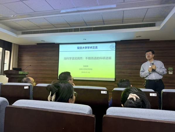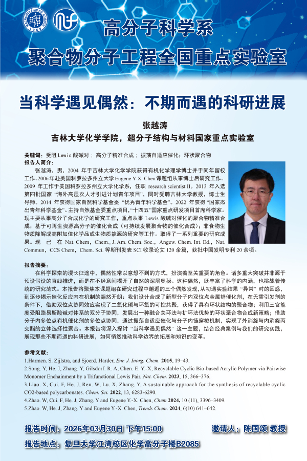 2026年3月30日,来自吉林大学的张越涛来复旦大学高分子科学系进行交流访问,并进行了题为“当科学遇见偶然:不期而遇的科研进展”的报告,报告聚焦了他们在研究过程中邂逅的三个偶然发现,从初遇实验结果“异常”时的困惑,到逐步揭示催化反应内在机制的豁然开朗:他们设计合成了新型分子内双位点金属锌催化剂,在无需引发剂的条件下,借助双位点协同效应实现了二氧化碳与环氧的可控共聚,获得了具有环状结构的聚合物;利用三官能度受阻路易斯酸碱对体系的双分子协同,发展出一种融合关环法与扩环法优势的环状聚合物合成新策略;借助分子内多位点有机催化剂的多位点协同,通过振荡自适应催化与分子内链穿梭机制,实现了外消旋与内消旋丙交酯的立体选择性聚合,深入探讨“当科学遇见偶然”这一主题,结合经典案例与他们的研究实践,展现那些不期而遇的科研进展,如何悄然推动科学边界的拓展和知识的变革。
