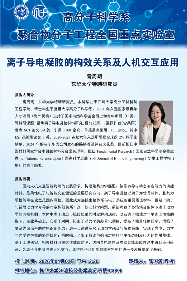 2026年4月2日,来自东华大学的雷周玥来复旦大学高分子科学系进行交流访问,并进行了题为“离子导电凝胶的构效关系及人机交互应用”的报告,报告围绕“离子与链段动力学介导的时空构效关系”这一核心科学问题,系统考察了多场耦合条件下离子动力学的调控机制、本体中离子输运与链段松弛的时空解耦规律,以及离子弛豫对非平衡态性能的影响。在此基础上,实现了对阴、阳离子动力学的差异化调控,提高了能量转换效率,增强了复杂界面信号的时序识别能力;进一步通过多尺度动力学耦合与解耦策略,实现了导电、力学与光学等性能的协同优化;同时揭示了离子解离与弛豫对材料非平衡态响应行为的作用规律。基于上述研究,相关材料已在柔性健康监测、透明导电器件及类脑智能凝胶体系中得到应用验证,为离子导电凝胶在人机交互、柔性电子和新型智能材料中的进一步发展奠定了基础。