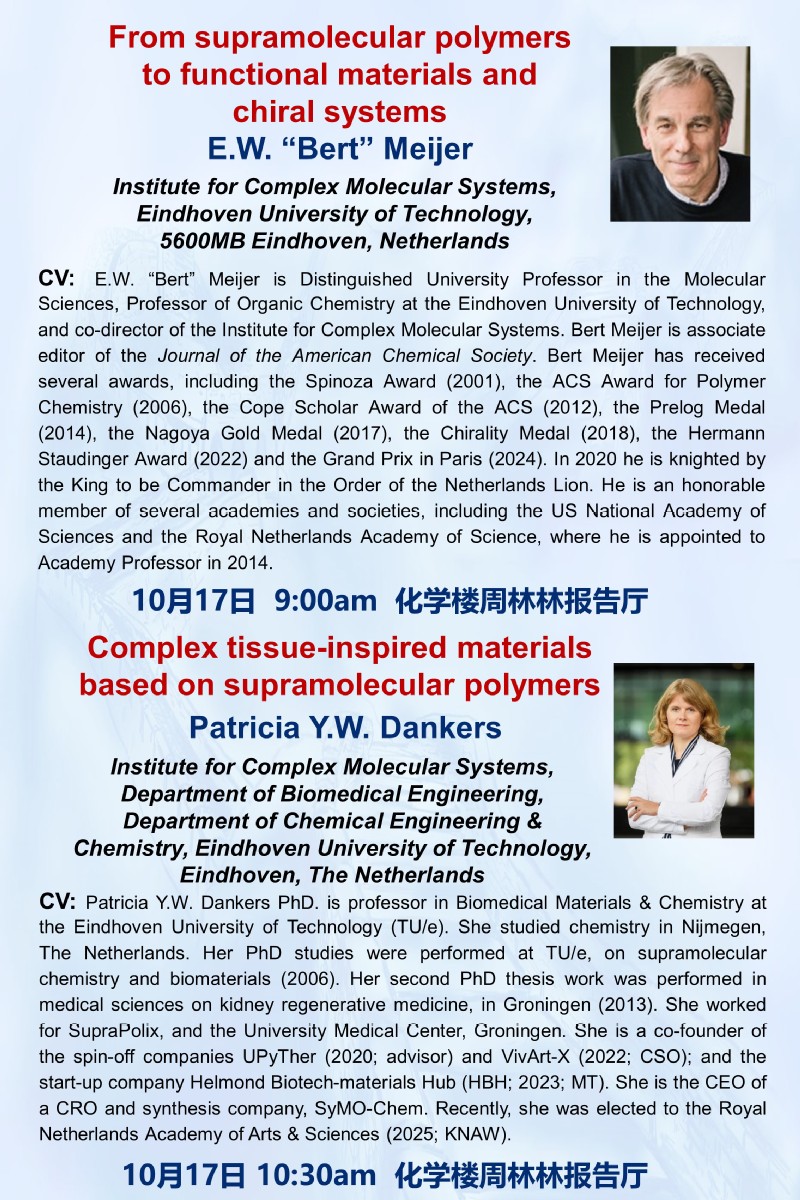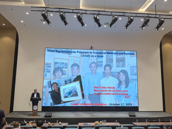 On October 17, 2025, E.W. Bert Meijer and Patricia Y.W. Dankers from Eindhoven University visited the Department of Macromolecular Science at Fudan University. They delivered an exciting and cutting-edge report on supramolecular polymers, ranging from basic science to biomedical applications, to the faculty and students present.