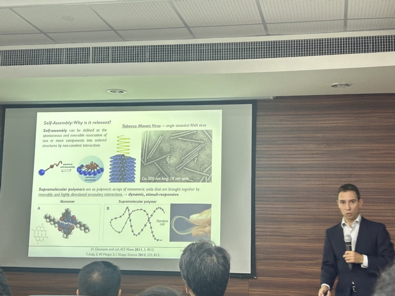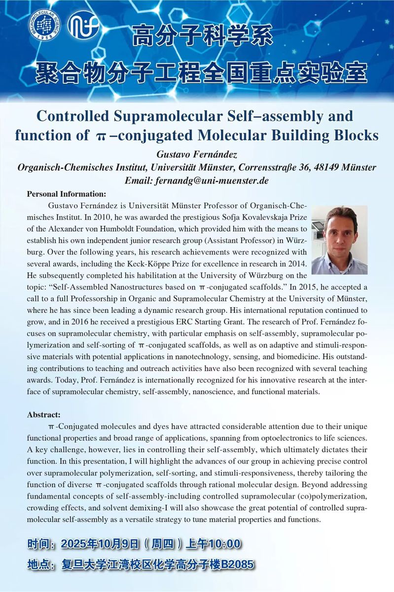 2025.10.09 Professor Gustavo Fernández from the University of Münster came to the Department of Macromolecular Science at Fudan University for an exchange visit.Furthermore, they presented a report titled Controlled Supramolecular Self-assembly and Function of m-Conjugated Molecular Building Blocks. The report introduced the progress of their team in achieving precise control over supramolecular polymerization, self-classification, and stimulus responses, thereby customizing the functions of various T-conjugated scaffolds through rational molecular design. In addition to addressing the basic concepts of self-assembly - including controlling supramolecular polymerization, crowding effects, and solvent demixing - it also demonstrated the great potential of controlling supramolecular self-assembly as a general strategy for adjusting material properties and functions.