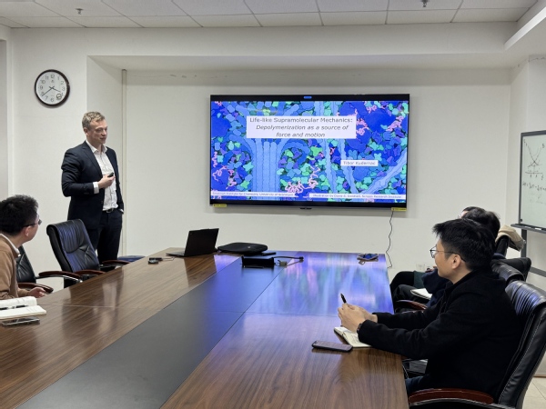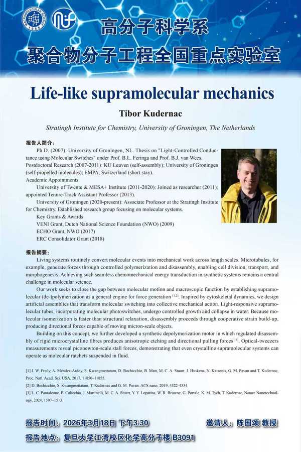 2026.03.18,Tibor Kudernac from University of Groningen visited the Department of Macromolecular Science at Fudan University and delivered a report titled Life-like supramolecular mechanics. The report introduced that they seek to close the gap between molecular motion and macroscopic function by establishing supramolecular (de-)polymerization as a general engine for force generation. Inspired by cytoskeletal dynamics, they design artificial assemblies that transform molecular switching into collective mechanical action Light-responsive supramolecular tubes, incorporating molecular photoswitches, undergo controlled growth and collapse in water. Because molecular isomerization is faster than structural relaxation, disassembly proceeds through cooperative strain build-up, producing directional forces capable of moving micron-scale objects. Building on this concept, we further developed a synthetic depolymerization motor in which regulated disassembly of rigid microcrystalline fibers produces anisotropic etching and directional pulling forces.
